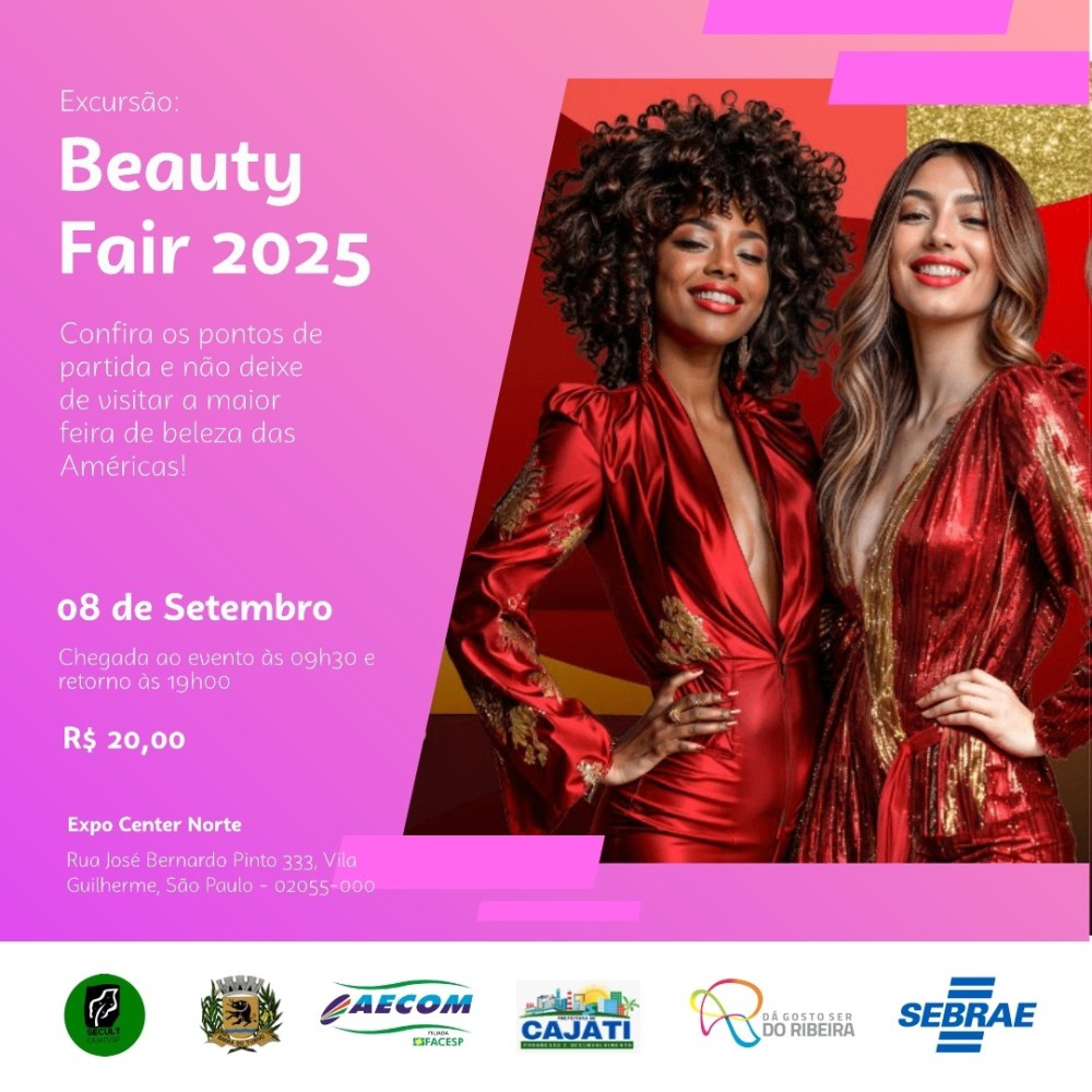 O Sebrae-SP, em parceria com a AECOM, convida profissionais da beleza e estética do Vale do Ribeira para participar da Beauty Fair 2025, a maior feira de beleza profissional das Américas e uma das maiores do mundo!