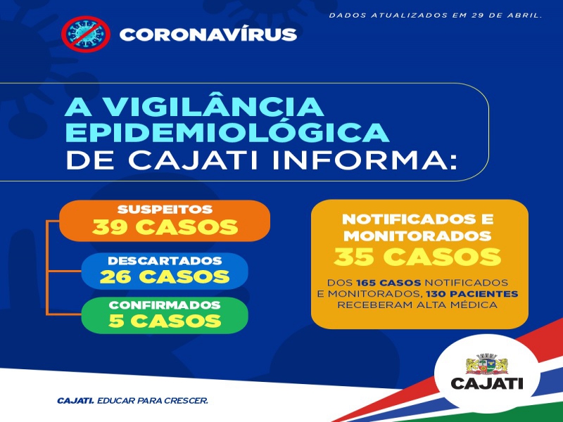 A Vigilância Epidemiológica de Cajati apresenta os números da COVID-19 dessa quarta-feira, 29 de abril: 39 casos suspeitos – desses, 5 casos confirmados para o novo Coronavírus e 26 descartados –, 165 pacientes notificados e monitorados em casa e desses, 130 receberam alta médica.